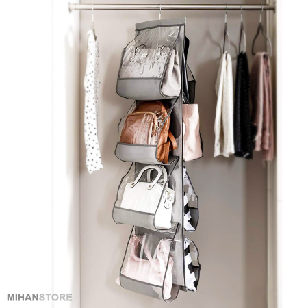 آویز کیف طبقاتی داخل کمد محصولی نوین و بسیار کاربردی است. این آویز به صورت دوطرفه همراه با قلاب آویز جهت آویزان کردن داخل کمد و یا پشت درب می باشد. آویز کیف طبقاتی امکان استفاده از حداقل فضای ممکن برای نگهداری کیف های شما را فراهم می کند. فضای محفظه های نگهدارنده به گونه ای طراحی شده که علاوه بر کیف از آن می توان جهت نگهداری کفش نیز استفاده نمود. از دیگر ویژگی های این آویز، جلوگیری از کثیف شدن، له شدن و خراب شدن کیف و کفش است. محصولی با طراحی جدید، ساده و در عین حال بسیار کاربردی که می تواند مشکل شما در نگهداری از کیف های دستی را برطرف کند. آویز و نگهدارنده کیف به صورت دوطرفه طراحی شده و ظرفیت آن 8 کیف می باشد.